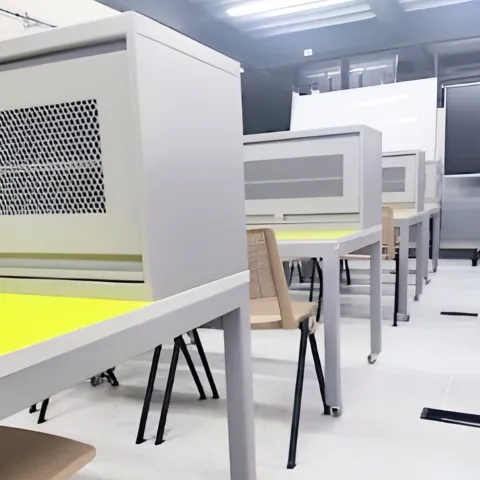 Diseñamos laboratorios seguros y eficientes con mobiliario a medida, incluyendo mesas, gabinetes y sillas.