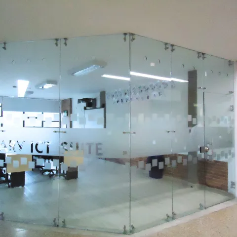Optimizamos la distribución con divisiones de vidrio y paneles acústicos para espacios colaborativos y áreas de estudio.